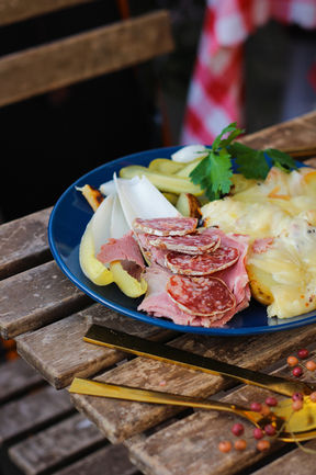 Raclette cheese with sautéed new potatoes, cured meats, chicory, pickles & cornichon